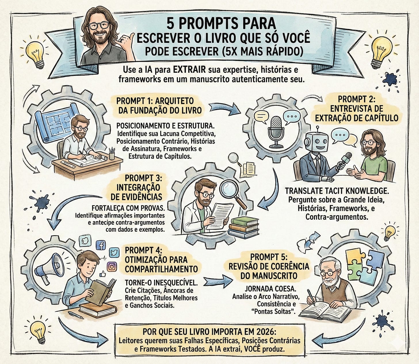 A inteligência artificial pode gerar livros, mas não o SEU livro. Use estes 5 prompts para extrair sua expertise, suas histórias e seus frameworks em um manuscrito que seja autenticamente seu.
